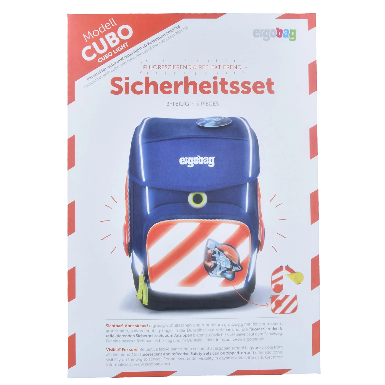 Fluoreszierendes Seitentaschen-Zip-Set aus drei Teilen in coolen Neonfarben passend für Ergobag Cubo-Modelle. Damit wird der Ergobag-Schulranzen zum echten Hingucker und bietet mehr Sicherheit im Straßenverkehr. Das Set verfügt über drei Klettflächen für Ergobag-Kletties. Hergestellt aus recycelten PET-Flaschen.